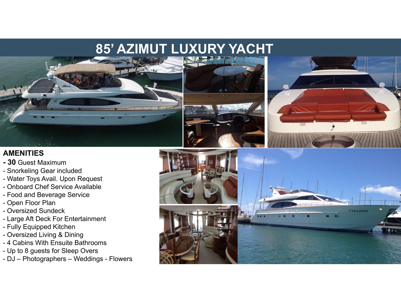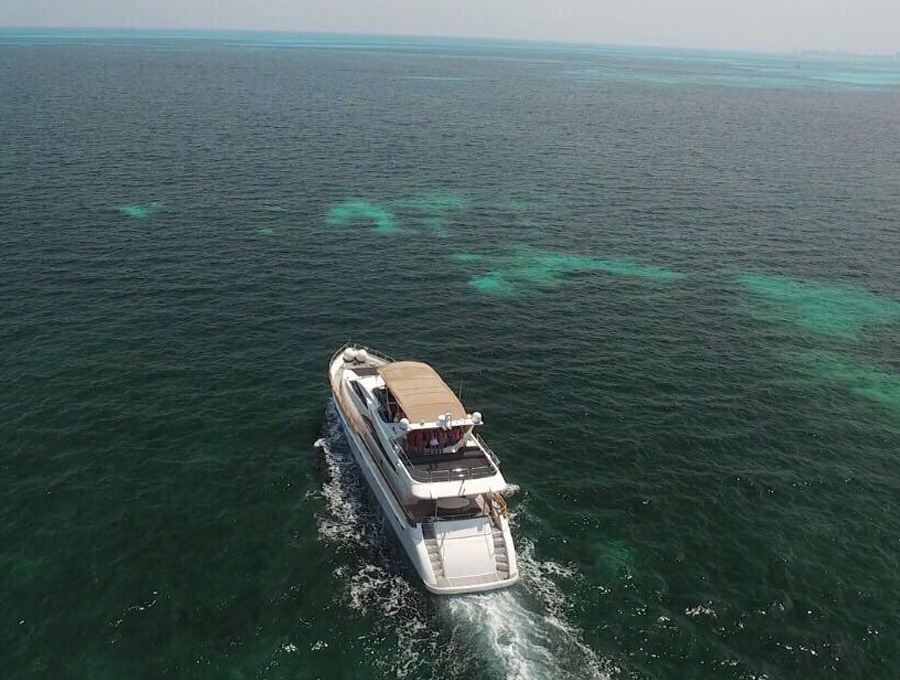 Visit Isla Blanca secluded beach where you will dine and play with the numerous water toys offered with the charter of this beautiful vessel.Snorkel along the Great Maya Reef or Cruise along the Cancun Hotel Zone and catch the Sunset.This charter itinerary can be easily modified to meet your desires.